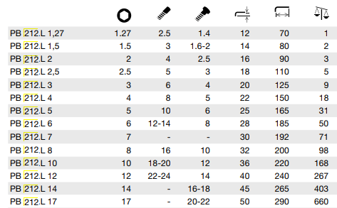 PB 212 L Key L-wrenches, long, with ball point • for hexagon socket screws • perfectly shaped ball point, allows screws to be turned at an angle of up to 30° • special alloy based on spring steel, exceptional elasticity coupled with high grade hardening • laser-marked serial number, lifetime guarantee
