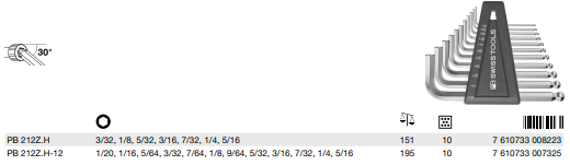 PB 212Z H Hex Key L-wrenches with ball point, set in a practical plastic holder, standard inch sizes.